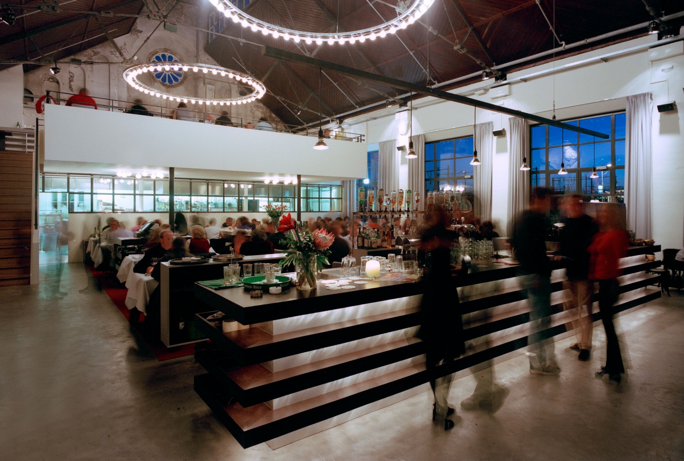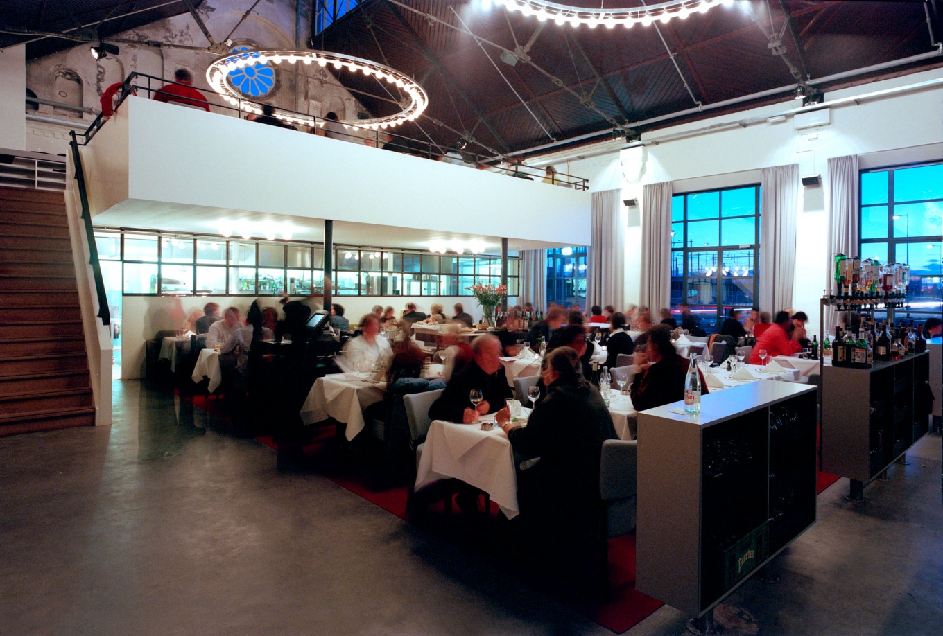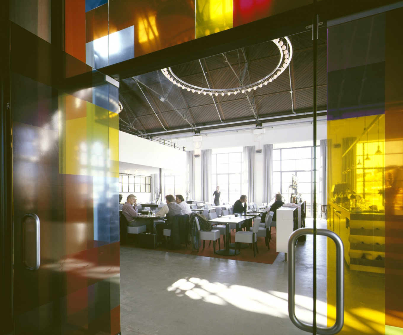 Enormous windows with steel frames have been placed in the old power station to let in the light during the day and to evoke the look and feel of a nightclub after the sun goes down. The glass partition with transparent blocks of colour between the restaurant and the entrance adds to this effect. When the lights go on, the festive glow they emit can be seen from afar. The bar in the middle of the restaurant is lit from below, and forms a division between the café and the restaurant area.Large, steel circular lights below the original roof form a visual link between the various areas.