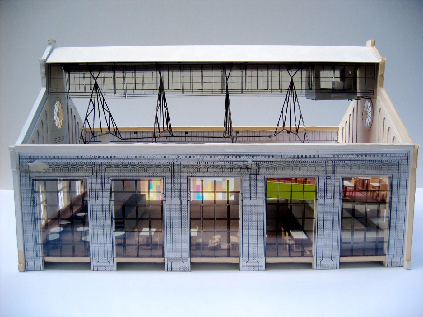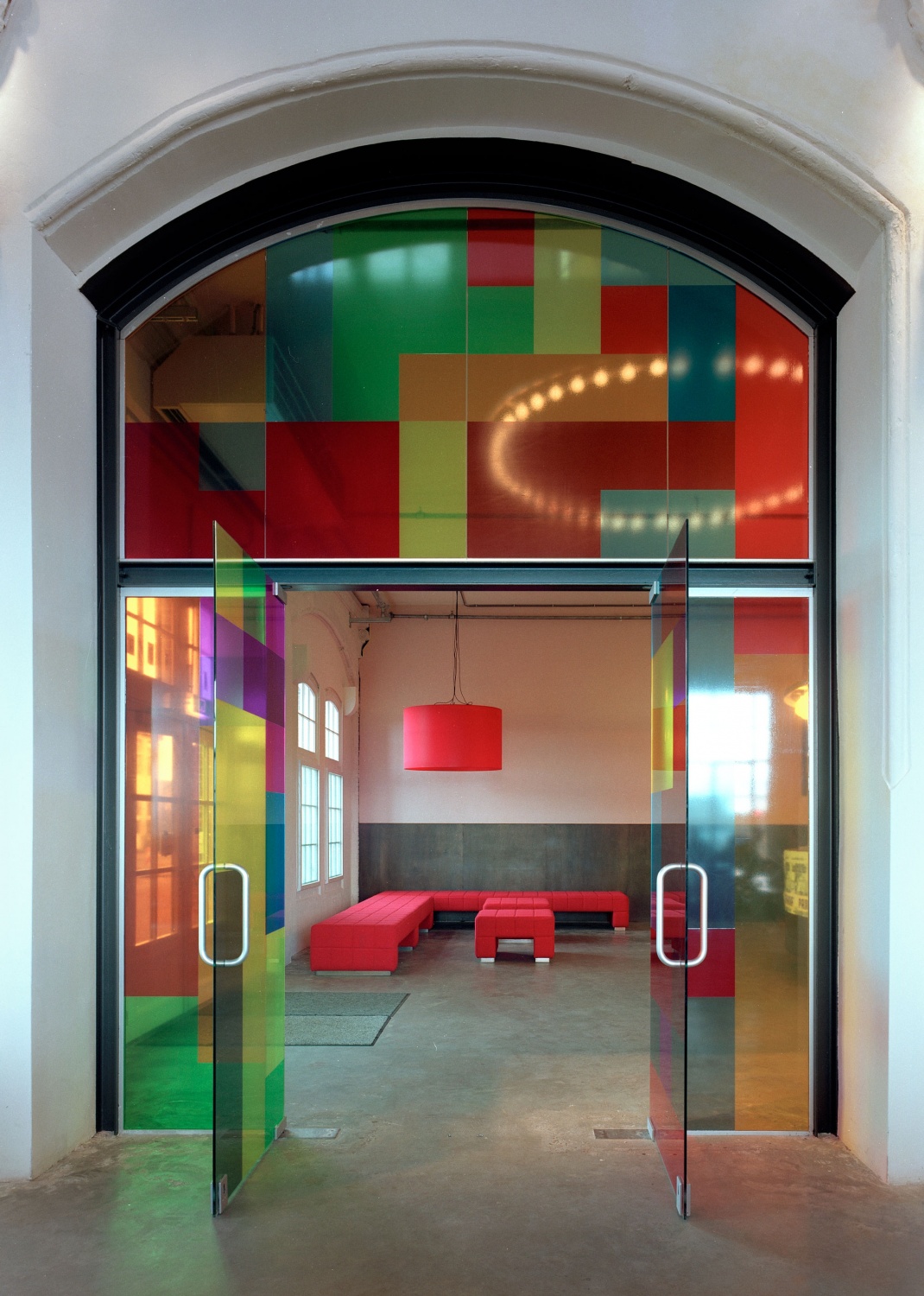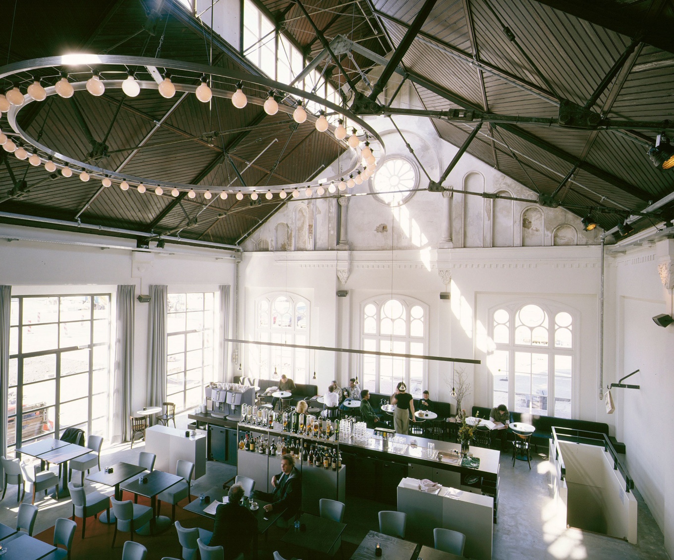 Enormous windows with steel frames have been placed in the old power station to let in the light during the day and to evoke the look and feel of a nightclub after the sun goes down. The glass partition with transparent blocks of colour between the restaurant and the entrance adds to this effect. When the lights go on, the festive glow they emit can be seen from afar. The bar in the middle of the restaurant is lit from below, and forms a division between the café and the restaurant area.Large, steel circular lights below the original roof form a visual link between the various areas.