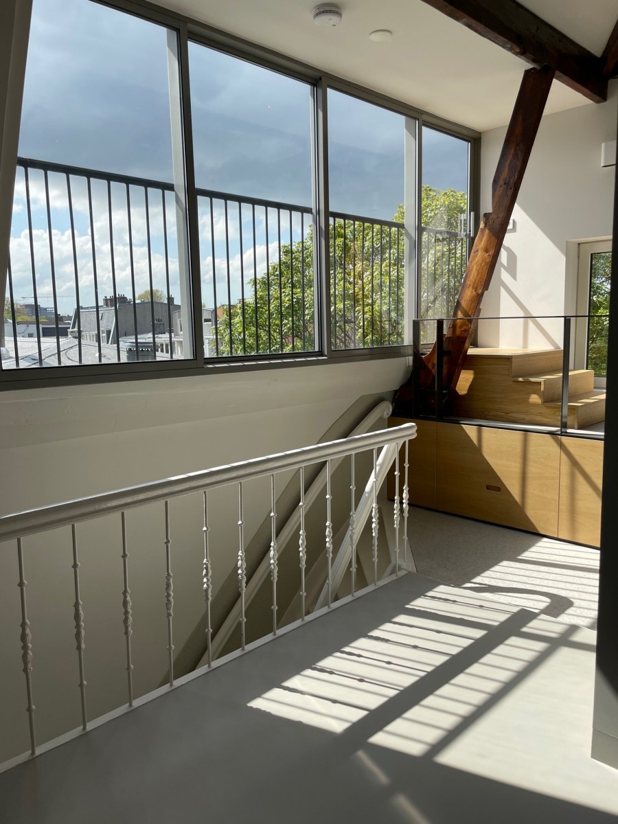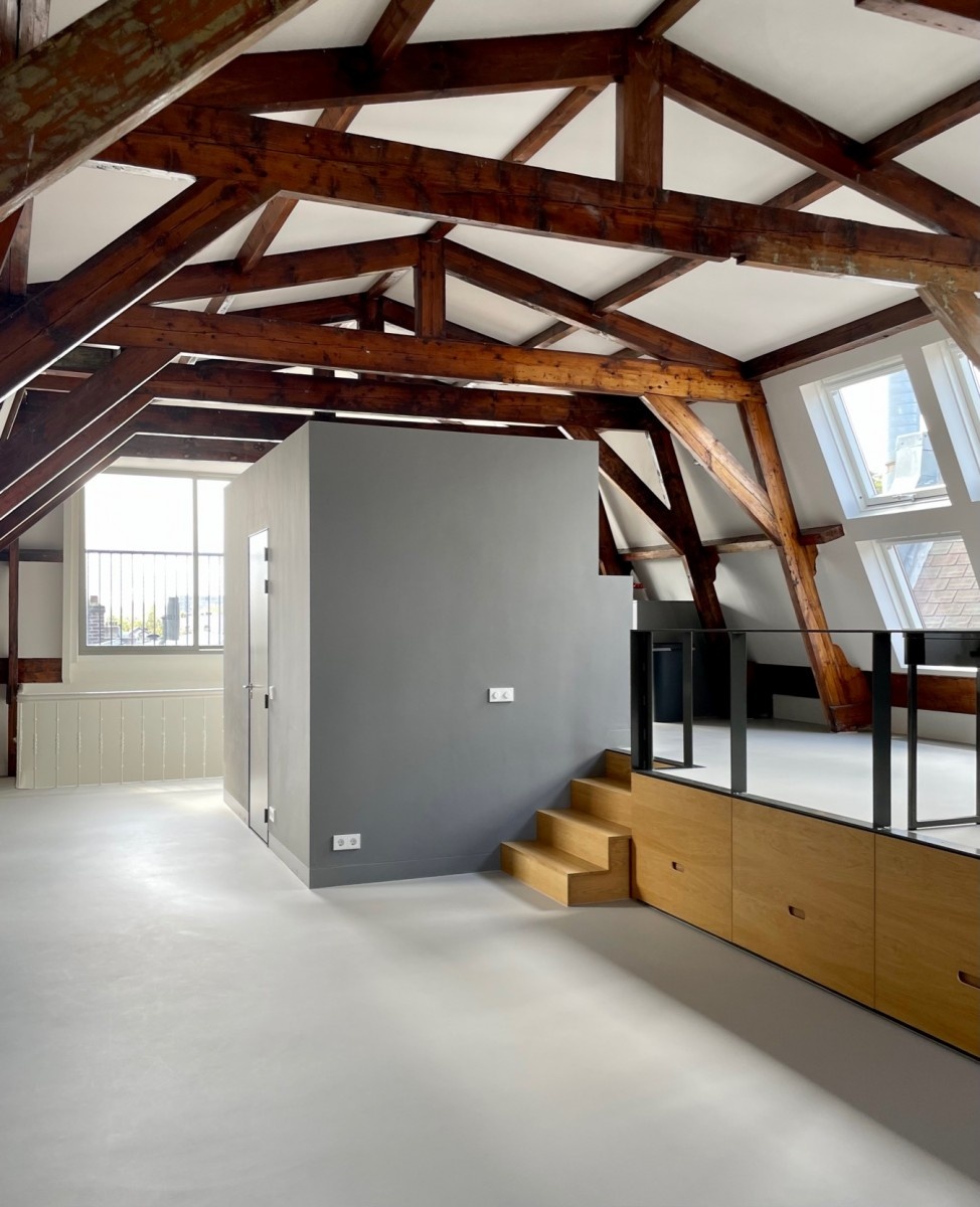 Door een grote glazen pui op de westkant te plaatsen en drie grote ramen in het Mansarde dak toe te voegen wordt de donkere zolder omgetoverd tot een licht appartement.