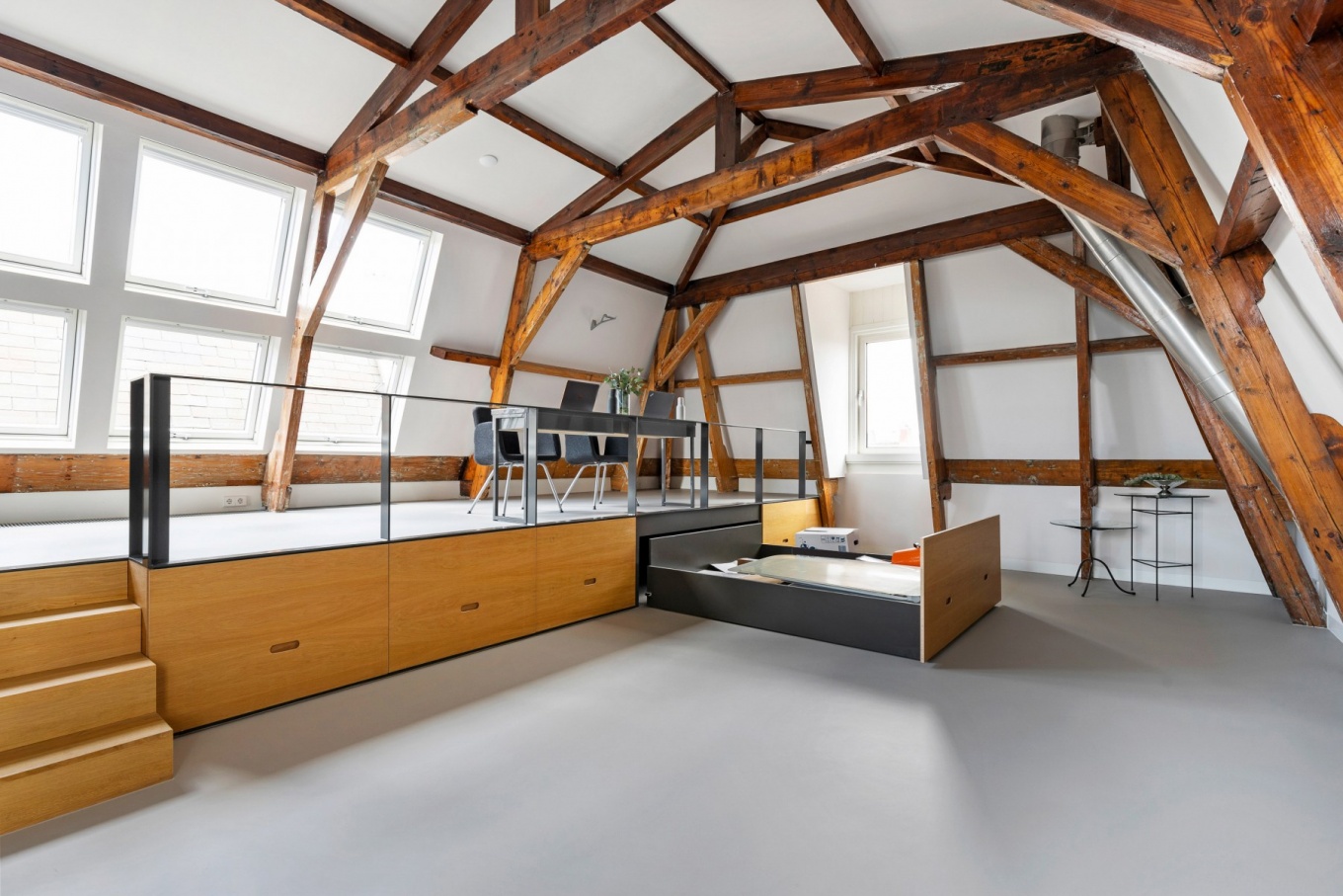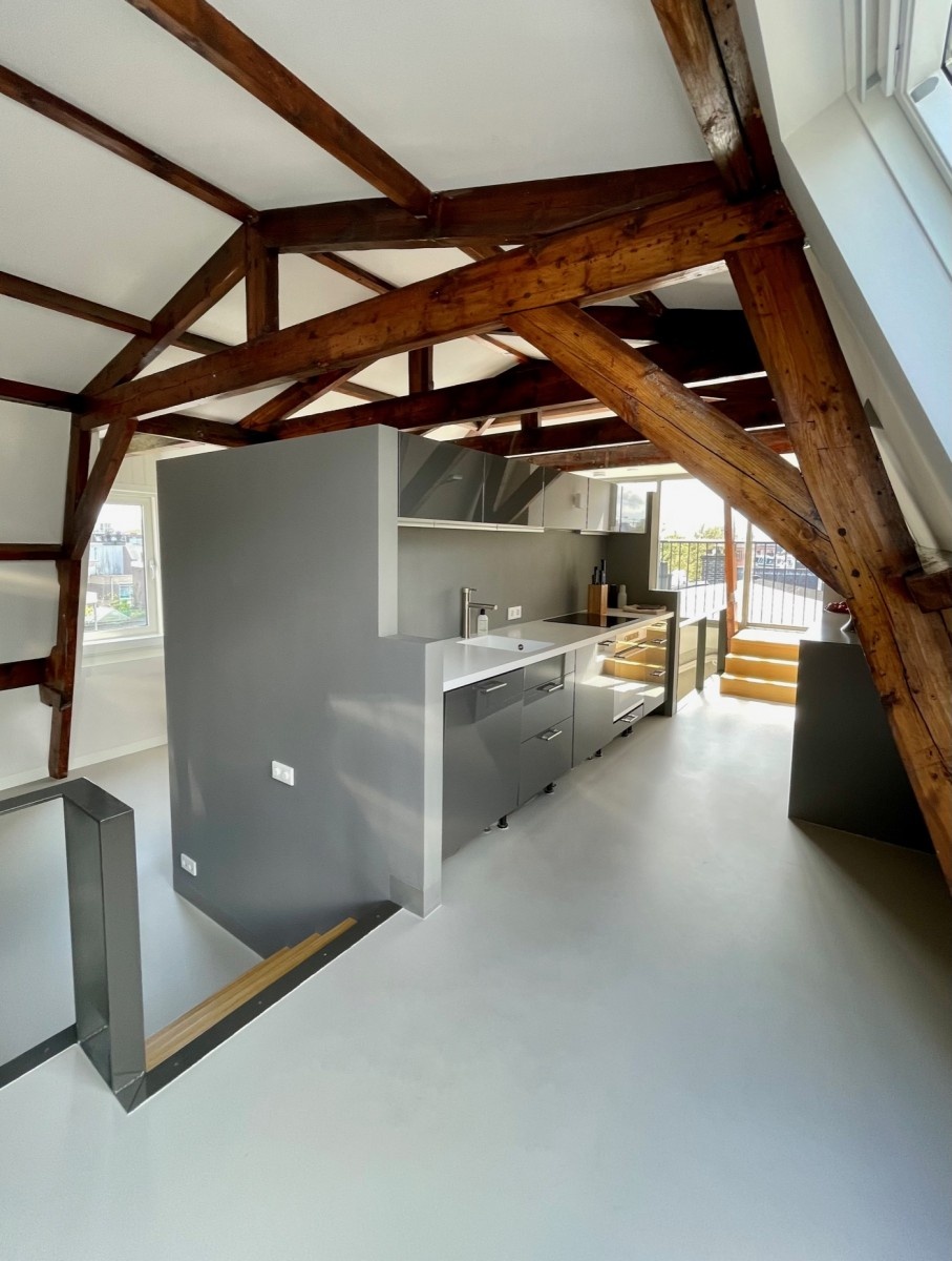 Over de gehele lengte van de zolder is een verhoogde vloer aangebracht, zodoende ligt de keuken aan het kleine terras en heb je uitzicht over de hele stad. De verhoogde vloer is voorzien van lades die dienen als berging en een lade zelfs als opbergplaats voor een tweepersoonsbed, op deze manier blijft maximale leefruimte over.